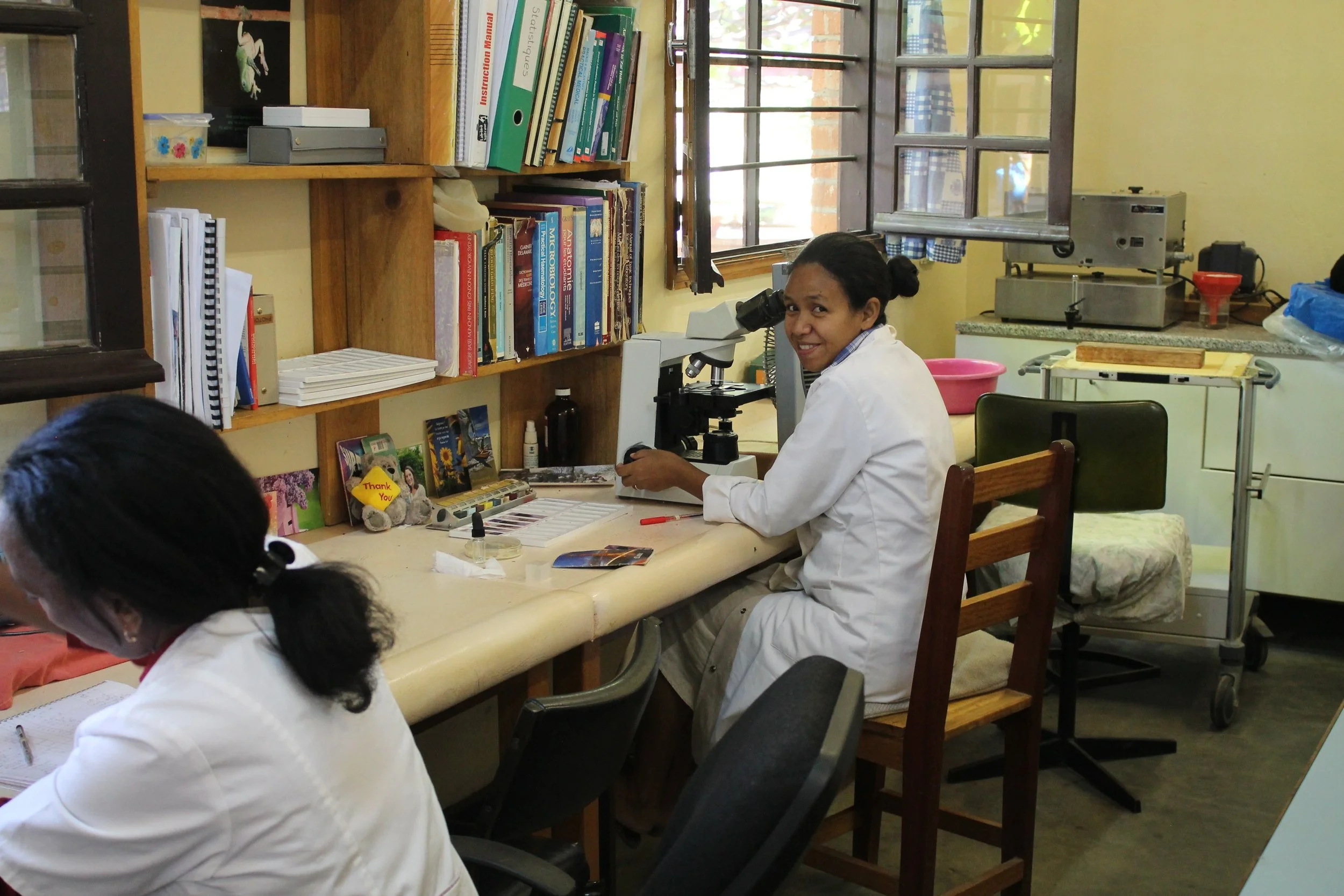 Once the hospital opened in June 1996, with the much larger and well-equipped laboratory, Annie started to train Malagasy laboratory technicians on the job. Debbie Simpson, a lab technician from Northern Ireland, joined in 1998 and gradually the number of locally trained Malagasy lab technicians grew. The lab has performed a vital role in showing the love of Christ to patients through the care and skill of the workers, and it has also been a place where patients passing through can hear the message of the gospel and receive gospel tracts from the lab team.